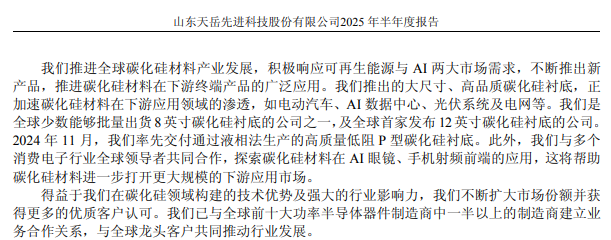 天岳先进在互动易回复投资者称,公司有关注到相关信息。当前以SiC为代表的第三代半导体正在随着终端领域的成功应用而进入快速发展期,公司在碳化硅半导体材料上所形成的技术优势,使得公司处于碳化硅半导体产业发展的前沿。