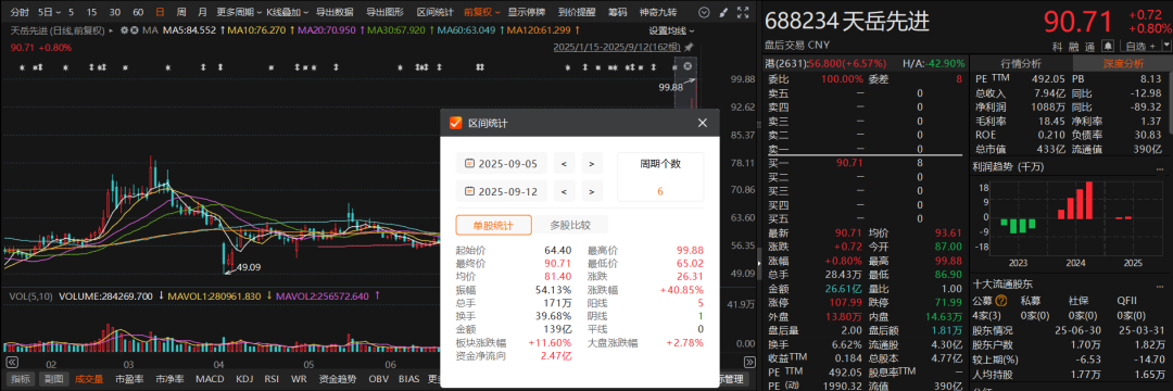 近日,A股碳化硅板块迎来上涨行情,天岳先进、天富能源、晶盛机电等概念股涨幅显著。比如,自9月5日起至12日收盘,天岳先进股价涨幅已经超过40%。