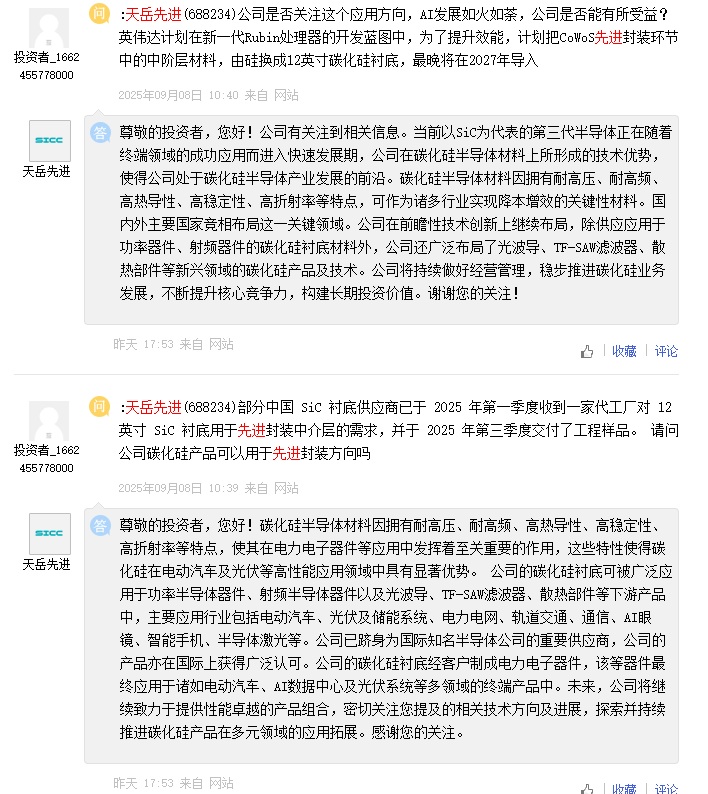 对于碳化硅应用于先进封装等相关问题,近期,多家A股碳化硅产业链公司也在互动平台披露了新进展。